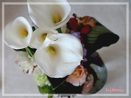 中央の「カラー」の長さを活かした大胆なアレンジメント♪