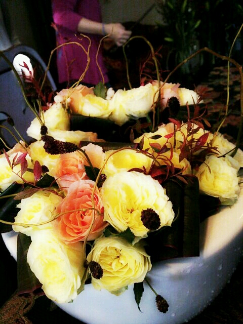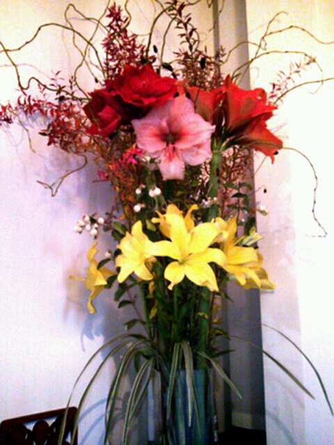 今月のお花は花瓶にアマリリスとユリ、雲竜柳を大胆に使ったアレンジです。